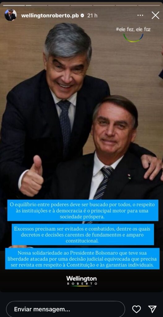 O deputado federal Wellington Roberto (PL-PB) usou suas redes sociais para demonstrar solidariedade ao ex-presidente Jair Bolsonaro, após os últimos desdobramentos judiciais envolvendo o capitão Bolsonaro.
